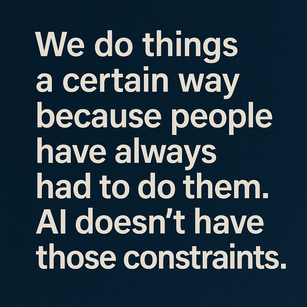 The truth is, we do things a certain way because people have always had to do them. People come with constraints — attention, time, scale, fatigue. AI doesn’t. And when you remove those constraints, you unlock an entirely new way to think about process design, decision-making, and value creation.